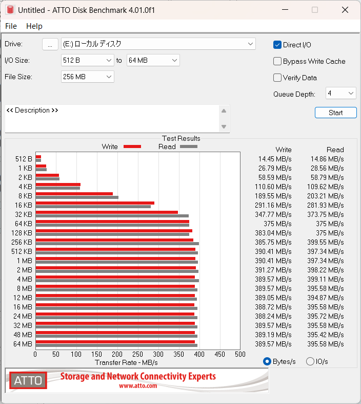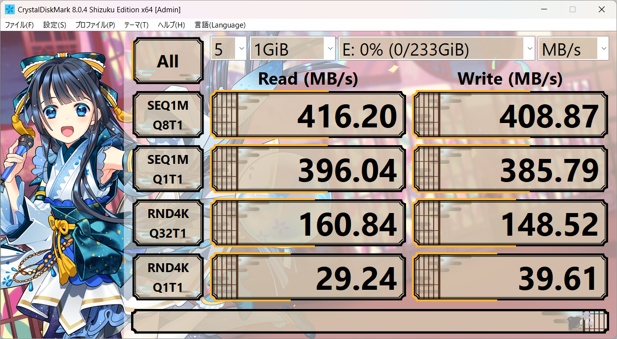 公表値通りではないですが、読み書き400MB/s以上出てます。