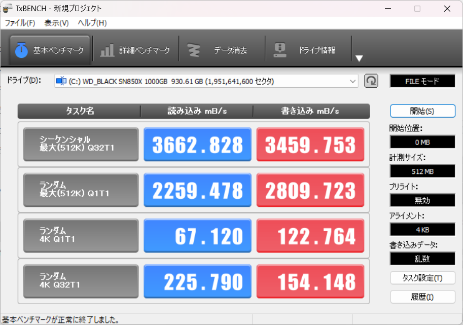 PCIe4.0 x4対応のNVMe SSDですが、うちには環境がなくPCIe3.0 x4でとりあえずベンチマーク取りました。