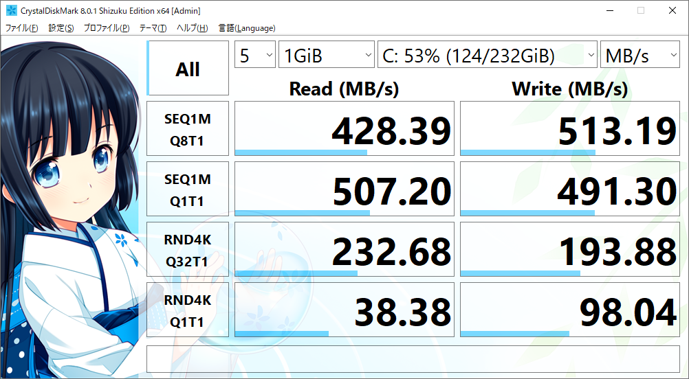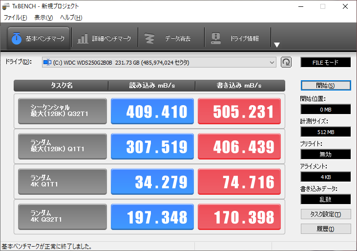読込560MB/s、書込530MB/s(ともにシーケンシャル)